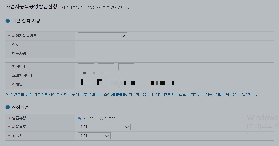 회원가입을 하고 로그인을 한 후 아래의 사업자등록증명발급 신청서를 작성합니다.