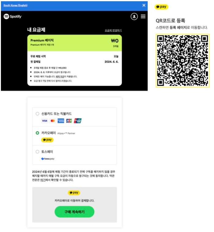 폰으로 QR코드를 스캔하면 카카오페이 결제 수단 등록 페이지로 이동하고 화면에 보이는 약관을 읽고 동의를 하면 스포티파이 3개월 무료 이용을 시작하게 됩니다. 3개월이 지나면 매월 8,690원의 요금이 카카오페이로 자동결제되니 무료체험 후 이용을 원하지 않는다면 꼭 구독 해지 하시길 바랍니다.