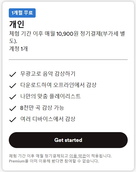 스포티파이 요금제 중 [개인] 요금제를 결제할 경우 1개월의 무료 체험기간이 제공됩니다.