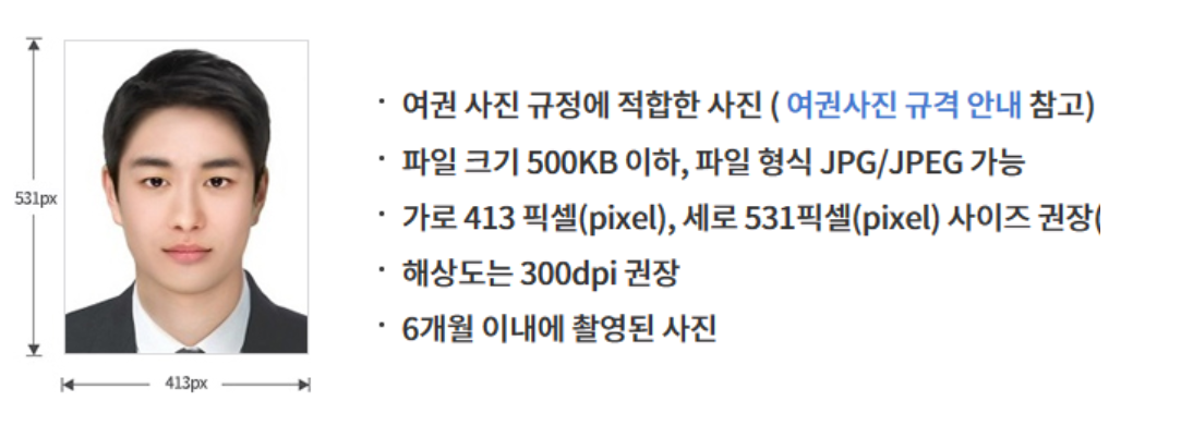 여권 사진 규격에 맞지 않는 경우 심사 시 반려될 수 있습니다. 더 자세한 여권사진 규격은 아래 링크를 통해 확인할 수 있습니다.