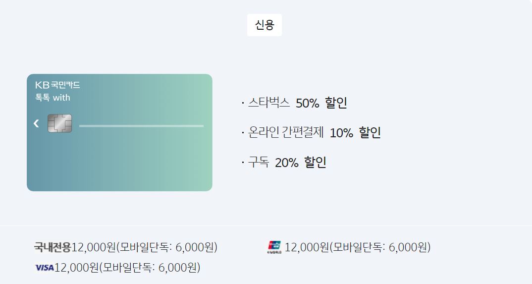 KB 국민 톡톡 with 카드를 이용하면 매월 구독 서비스 20% 할인이 가능합니다. 연회비 12,000원에 전월실적이 40만원 이상이면 혜택을 받을 수 있고 할인 적용이 가능한 서비스는 웨이브, 티빙, 넷플릭스, 유튜브 프리미엄 등입니다.