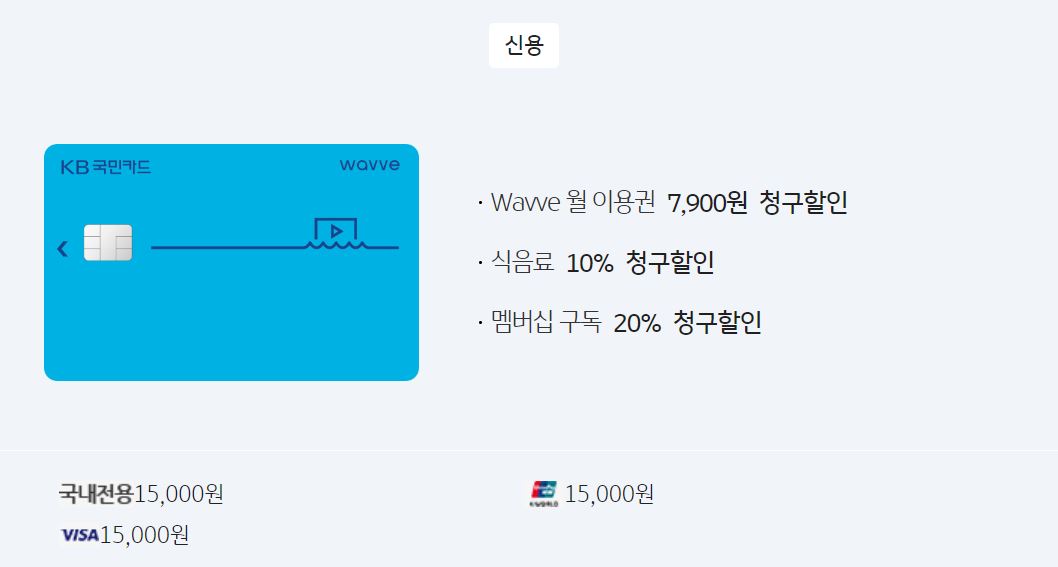 KB 국민 웨이브 카드를 이용하면 웨이브 무료 구독이 가능합니다. 국내외겸용 연회비 15,000원에 전월실적이 30만원 이상이면 웨이브 월 이용권 7,900원이 청구할인 됩니다.