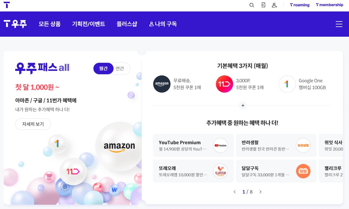 우주패스 올(all)과 우주패스 라이프(life)는 월 9,900원에 아마존, 11번가 등 온라인 쇼핑과 세븐일레븐, 투썸플레이스 등 외식 카테고리에서도 추가 혜택을 받아 생활 편의까지 누릴 수 있으니 SKT를 이용하시는 분들은 우주패스를 적극 활용하시는 것이 이득입니다.