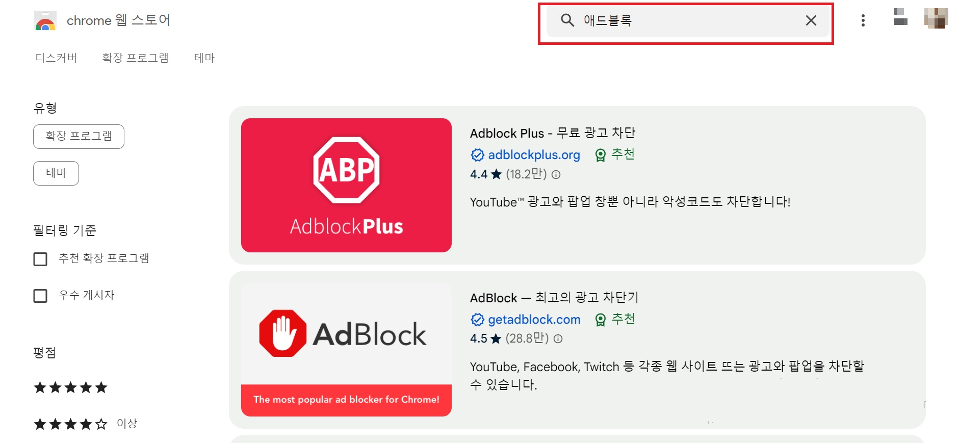 크롬을 사용하는 분들이라면 구글 확장 프로그램을 이용해서 유튜브를 광고 없이 볼 수 있습니다.