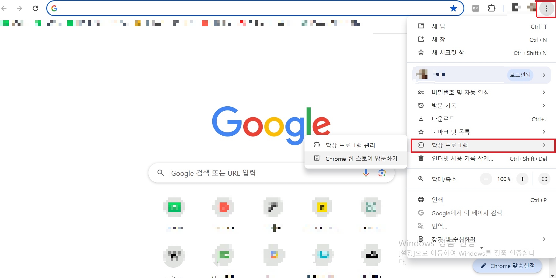 [1] 크롬 화면에서 오른쪽 상단에 점 세개 (· · ·) 를 누른 후 [확장프로그램] - [chrome 웹스토어 방문하기] 를 눌러 주세요.