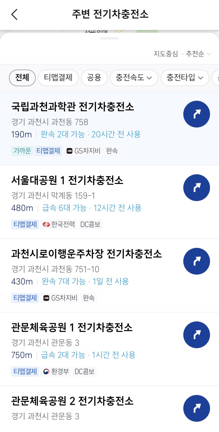 티맵에서도 현위치에서 인근의 전기차 충전소의 위치를 확인할 수 있습니다.